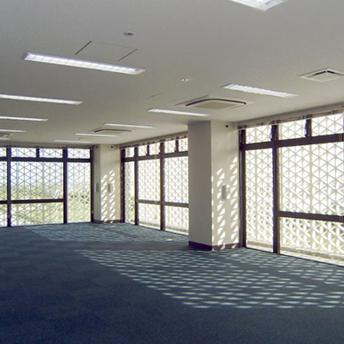 事務所棟として、外壁面にUFCル-バ-(超高強度繊維補強コンクリ-ト製ル-バ-)を用い沖縄の強い日射をやわらげ、省エネ化を図った建物とした。1階に利便施設、2階に託児所、6階にラウンジと、建物内で働く人々の環境に配慮した施設。